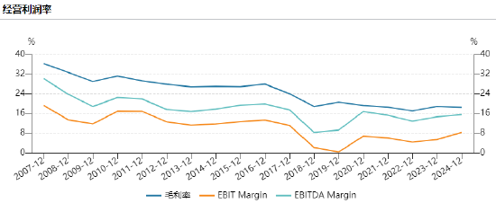 毛利率角度,从2010年的31%,降至2024年的18.5%。