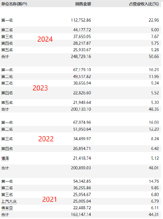 数据显示,双林股份前五大客户收入占公司营收的比例正不断提升,从2021年的44%,提升至2024年的50%以上。